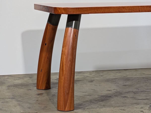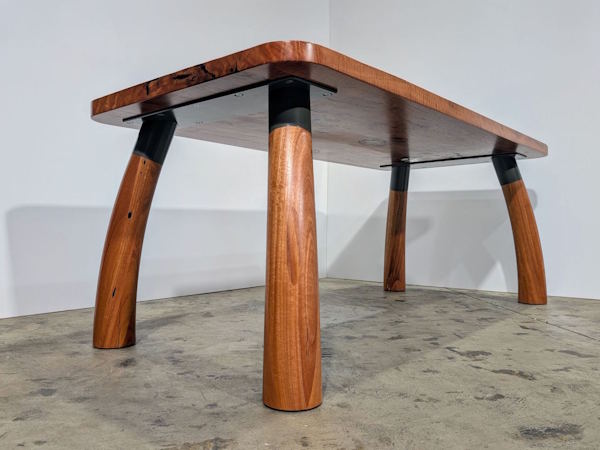 A distinctive dining table with curved, flared legs, clean lines and generous material proportions. Custom made powdercoated steel components allow for a frameless design and easy removal of legs for transport. Well suited to modern, mid century, minimalist or coastal interiors depending on the material choice.