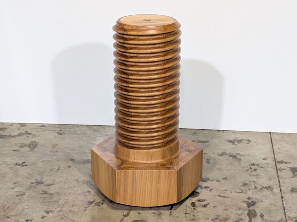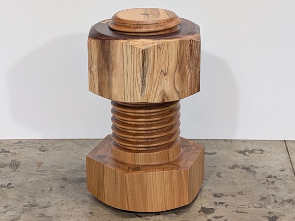 We normally make these from urban salvaged timber that we have milled and dried in house, but due to their laminated contruction we can also make these from a range of sustainable commercial timbers too if you have a preferred timber type. This piece measures 45cm x 52cm wide x 78.5cm high when standing up. The threaded part measures 30cm diameter x 60cm high.